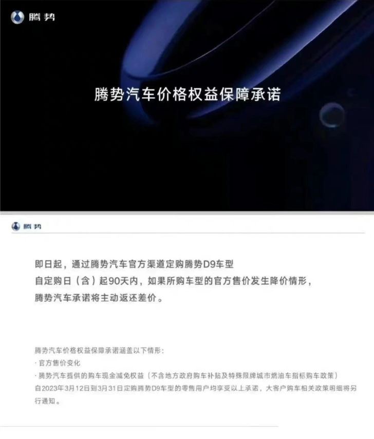 2023 年 3 月 31 日前通過官方渠道定購騰勢 D9 車型,自定購日 (含) 起 90 天內,如果所購車型的官方售價發生降價情形,騰勢汽車承諾將主動返還差價。