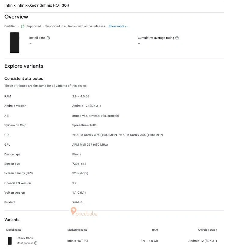Infinix Hot 30i 手機(型號 X669)配置了 4GB 內存,將運行完整 Android 12 系統。