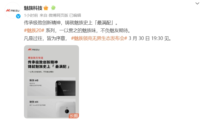 3 月 16 日消息,魅族此前官宣將于 3 月 30 日 19:30 在上海?梅賽德斯-奔馳文化中心舉行“魅族 ∞ 領(lǐng)克無界生態(tài)發(fā)布會”。屆時,包括魅族 20 系列旗艦手機(jī)、Flyme 10、Flyme Auto 車載人機(jī)交互軟件等新品都將一同亮相發(fā)布會。