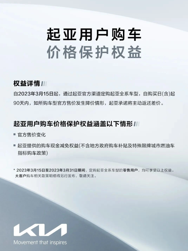 3 月 16 日消息,起亞汽車今日發布說明稱,自 2023 年 3 月 15 日起,通過起亞官方渠道購買起亞全系車型,自購買日(含)起 90 天內,如所購車型官方售價發生降價情形,起亞承諾將主動返還差價。
