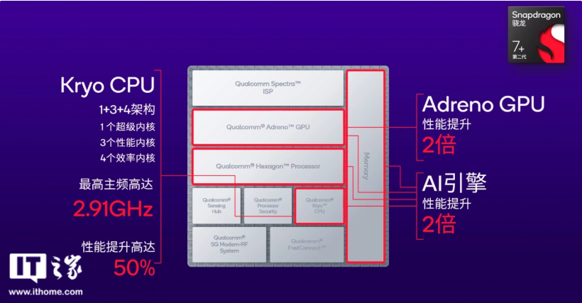 第二代驍龍7+作為一款擁有革新性能的驍龍7系平臺,將帶來眾多非凡體驗。高通Kryo CPU的最高主頻高達2.91GHz,性能提升超過50%。同時,高通Adreno GPU性能提升2倍。第二代驍龍7+還實現了高達13%的整體系統能效提升,支持更持久的日常使用。整個平臺集成了終端側AI功能。