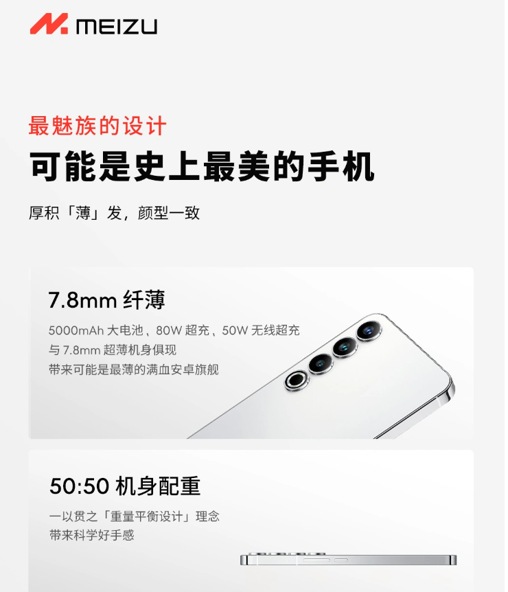 IT之家從圖中獲悉,魅族 20 Pro 機(jī)身厚度僅 7.8mm,配重 50:50.電池為 5000mAh,支持 80W 超充 + 50W 無線充電;配備視覺四等邊全面屏,最高 93.95% 屏占比,最窄 1.57mm 邊框;后攝模組位置采用黃金比例設(shè)計(jì),鏡頭微凸簡(jiǎn)約。全系標(biāo)配金屬中框,采用納米級(jí)真空拋光。