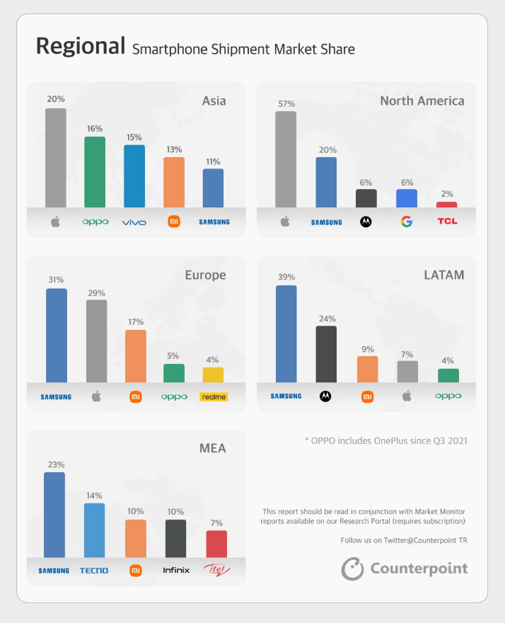 3 月 22 日消息,市場(chǎng)調(diào)查機(jī)構(gòu) Counter Point 于今天發(fā)布了 2022 年第 4 季度智能手機(jī) | 移動(dòng)市場(chǎng)報(bào)告,表示該季度全球智能手機(jī)出貨量為 3.0264 億部,同比下降了 19%。