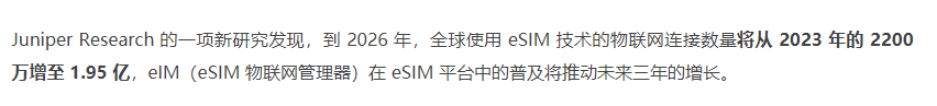 3月22日消息:Juniper Research 的一項新研究發(fā)現(xiàn),到 2026 年,全球使用 eSIM 技術的物聯(lián)網連接數(shù)量將從 2023 年的 2200 萬增至 1.95 億,eIM(eSIM 物聯(lián)網管理器)在 eSIM 平臺中的普及將推動未來三年的增長。