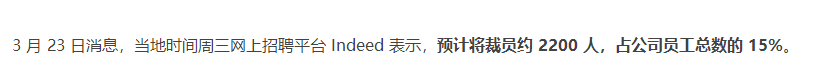 3 月 23 日消息,當地時間周三網上招聘平臺 Indeed 表示,預計將裁員約 2200 人,占公司員工總數的 15%。