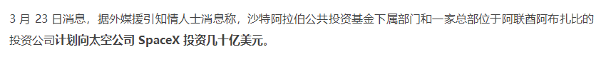 3 月 23 日消息,據外媒援引知情人士消息稱,沙特阿拉伯公共投資基金下屬部門和一家總部位于阿聯酋阿布扎比的投資公司計劃向太空公司 SpaceX 投資幾十億美元。