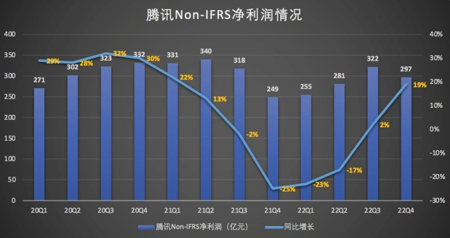 2022 年 Q4.騰訊降本增效有了一定的成效,營收同比增長 1% 至 1449.54 億元,凈利潤同比增長 12% 至 1062.68 億元,非國際財務報告準則凈利潤 297.11 億元,同比增長 19%。