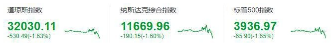 道瓊斯指數(shù)收于 32030.11 點,下跌 530.49 點,跌幅 1.63%;標準普爾 500 指數(shù)收于 3936.97 點,跌幅 1.65%;納斯達克指數(shù)收于 11669.96 點,跌幅 1.60%。道指和標指創(chuàng)今年 3 月 9 日以來最大單日跌幅,納指則創(chuàng)今年 3 月 10 日以來最大單日跌幅。