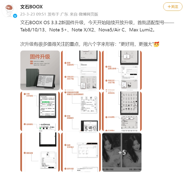 3 月 23 日消息,據文石官方消息,文石今日開始推送 BOOX OS 3.3.2 固件升級,首批適配型號包括 Tab8/10/13、Note 5+、Note X / X2、Nova5 / Air C、Max Lumi2.