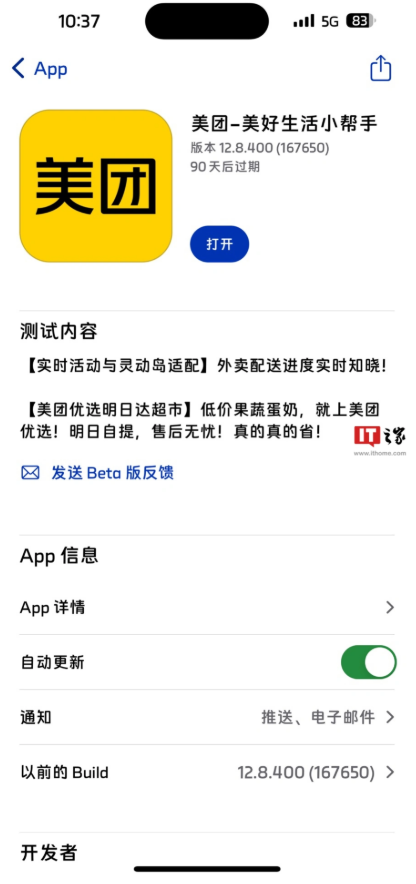 3 月 23 日消息,據(jù)IT之家網(wǎng)友反饋,美團(tuán) iOS 版最近推出了 12.8.400 (167650) 測試版,帶來了實(shí)時(shí)活動(dòng)與靈動(dòng)島適配,外賣配送進(jìn)度實(shí)時(shí)知曉。