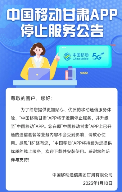 2023 年 1 月 10 日,中國(guó)移動(dòng)甘肅 App 發(fā)布公告,宣布停止服務(wù)并升級(jí)至中國(guó)移動(dòng) App。可以看出,全國(guó)各省 / 直轄市 App 或?qū)⒄系街袊?guó)移動(dòng) App。