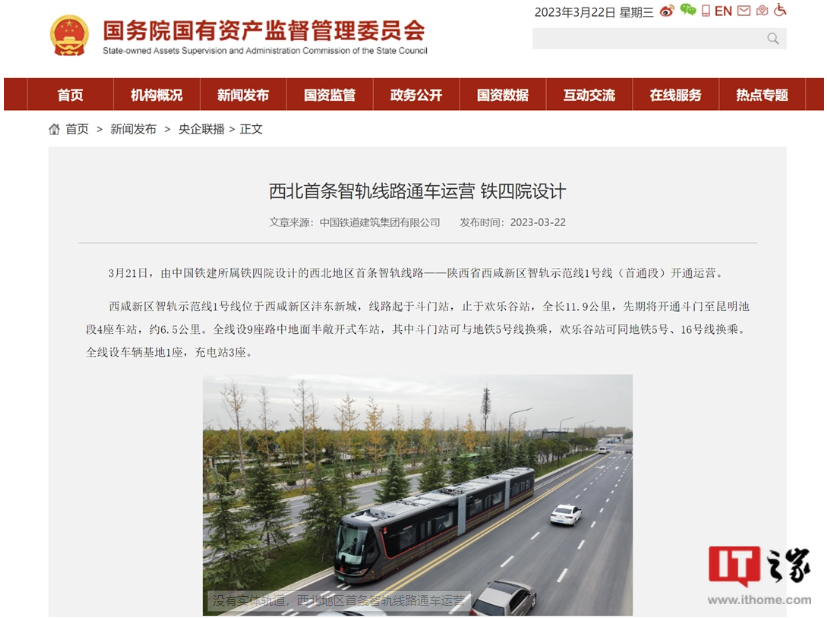3 月 23 日消息,據國資委網站,西北地區首條智軌線路 —— 陜西省西咸新區智軌示范線 1 號線(首通段)于 3 月 21 日開通運營。