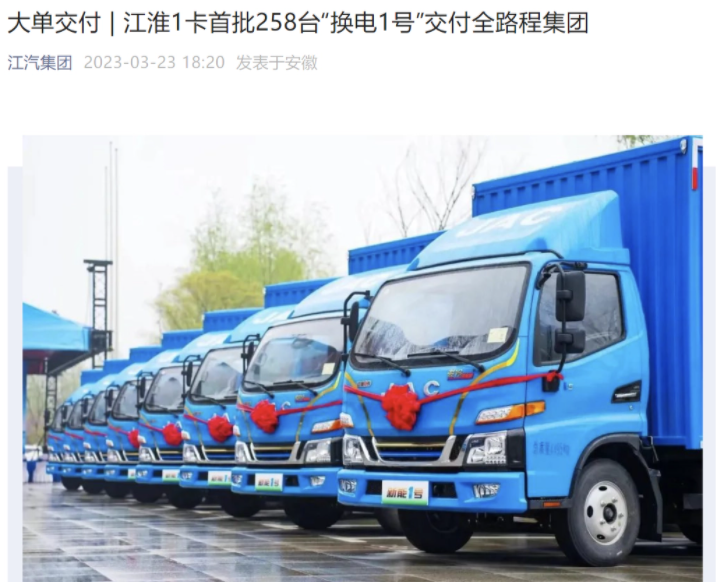 原標題:江汽集團:江淮 1 卡首批 258 臺“換電 1 號”新能源輕卡交付