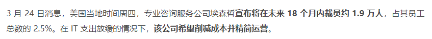 3 月 24 日消息,美國當地時間周四,專業咨詢服務公司埃森哲宣布將在未來 18 個月內裁員約 1.9 萬人,占其員工總數的 2.5%。在 IT 支出放緩的情況下,該公司希望削減成本并精簡運營。