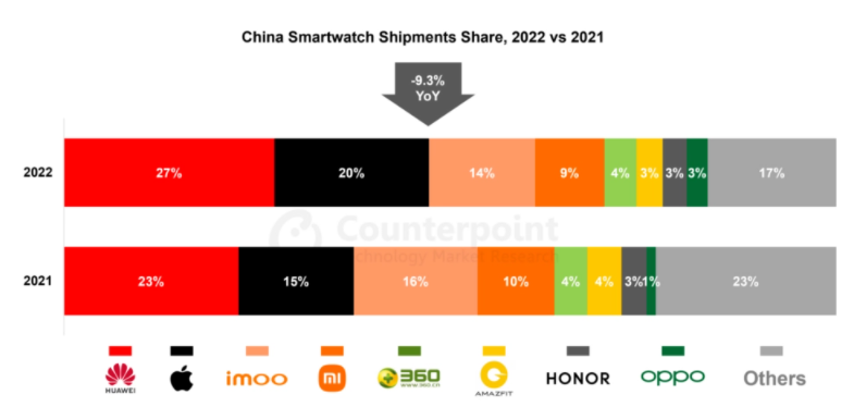3 月 24 日消息,根據市場調查機構 Counterpoint Research 公布的最新報告,2022 年國內智能手表出貨量同比下降了 9.3%,而同期全球智能手表出貨量增長了 12%。