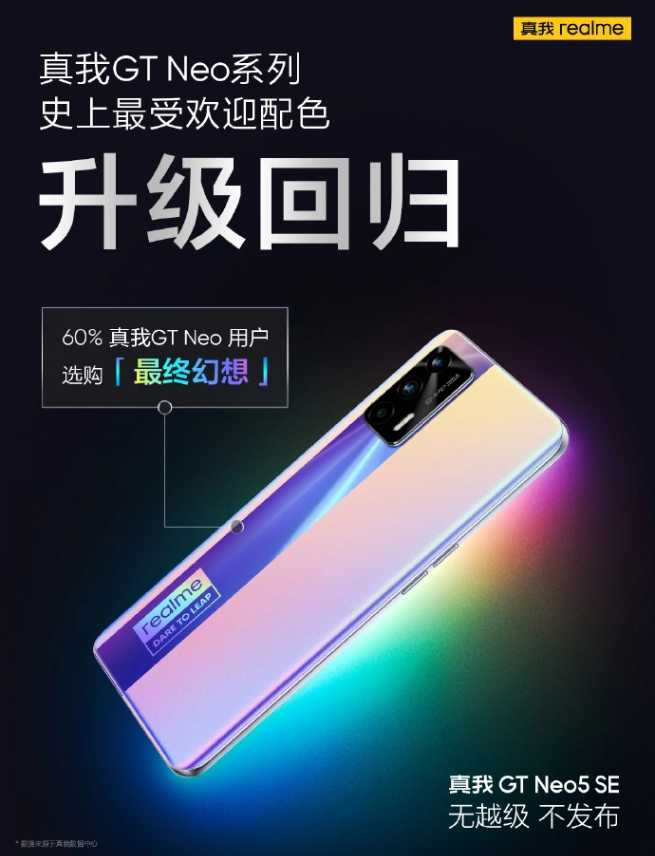 realme 真我手機官方已宣布,真我GT Neo5 SE 手機將于 4 月 3 日 14 點發布。真我GT Neo 系列史上最受歡迎配色「最終幻想」即將升級回歸,將出現在真我GT Neo5 SE 手機上。