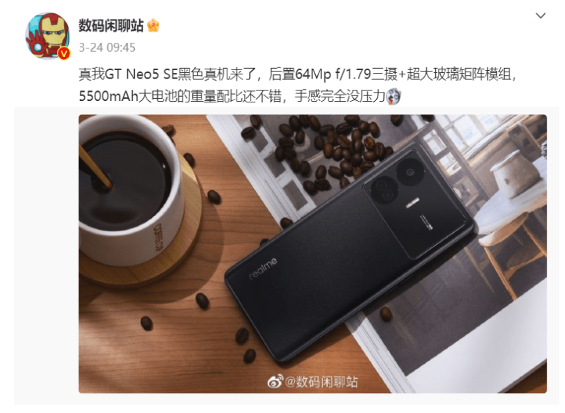 微博博主 @數碼閑聊站 曝光了 realme GT Neo5SE 黑色真機,后置 64MP(光圈 f / 1.79)三攝 + 超大玻璃矩陣模組,內置 5500mAh 大電池,重量配比還不錯,手感完全沒壓力。