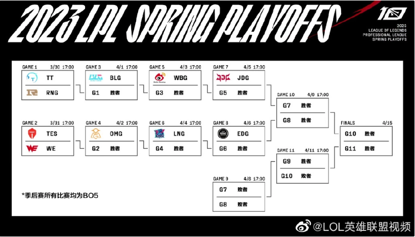 季后賽賽程均為 BO5.將于 3 月 30 日正式開啟,首日將由 TT 戰隊對戰 RNG 戰隊。