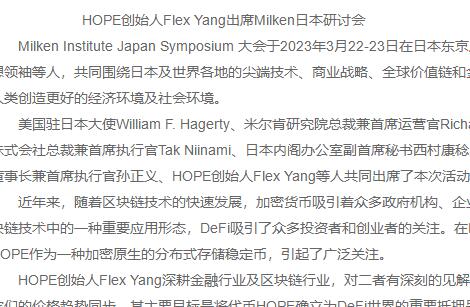 Milken Institute Japan Symposium 大會(huì)于2023年3月22-23日在日本東京成功舉辦,本次大會(huì)邀請(qǐng)了各行業(yè)頂尖的企業(yè)家、投資者、政治家、思想領(lǐng)袖等人,共同圍繞日本及世界各地的尖端技術(shù)、商業(yè)戰(zhàn)略、全球價(jià)值鏈和金融市場(chǎng)創(chuàng)新等問題做高端探討,旨在為全球可出續(xù)發(fā)展注入活力,為人類創(chuàng)造更好的經(jīng)濟(jì)環(huán)境及社會(huì)環(huán)境。