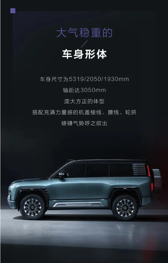 動力方面,新車搭載了“易四方”動力系統,提供四輪四電機,車輛單電機最大功率 220-240kW,最大扭矩 320-420N?m,有著最快 3 秒級別的零百加速表現,同時可以實現原地掉頭、爆胎控制等多種出色能力。此外,該車還配備有易四方刀片電池及非承載式車身。
