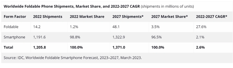 原標題:復合年增長率為 27.6%,IDC 預估 2027 年可折疊手機出貨量 4810 萬部, 營收 420 億美元