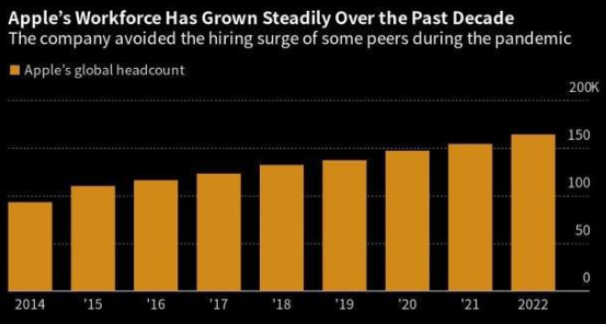 截至去年9月,蘋果公司共有16.4萬名員工。在疫情期間,該公司沒有像其他大型科技公司那樣迅速擴大員工規模,也因此避免了大規模裁員。