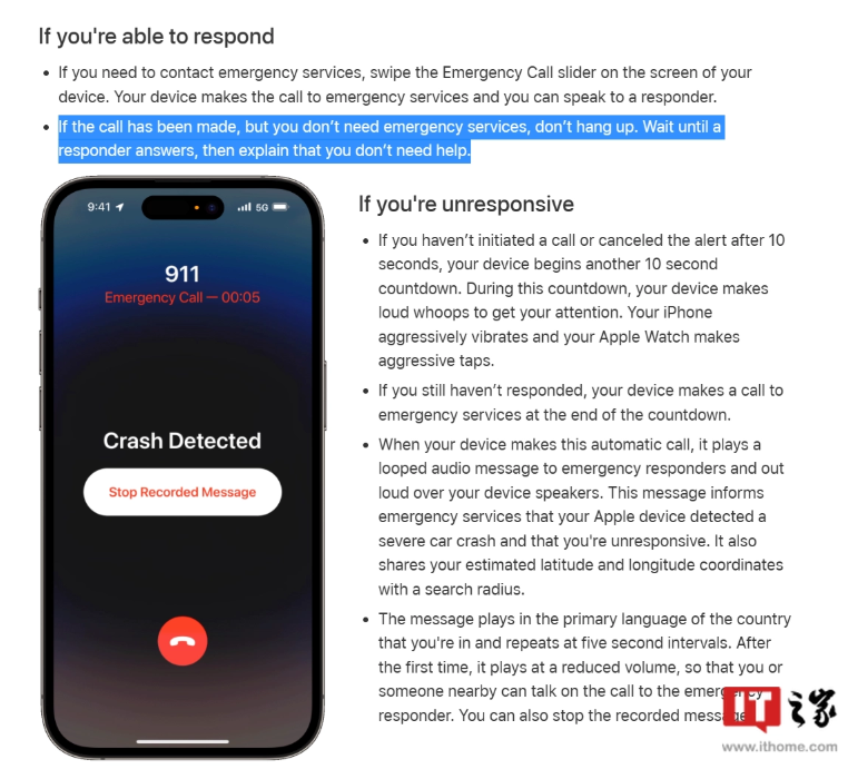 蘋果在最近幾次 iOS 16 更新中優(yōu)化了碰撞檢測(cè),以減少誤報(bào)情況。IT之家查看蘋果官網(wǎng)發(fā)現(xiàn),在最近更新的車禍檢測(cè)支持文檔中,蘋果還更改了在意外撥打電話時(shí)對(duì)用戶的建議,改為不要掛斷電話,而是向緊急響應(yīng)人員解釋不需要幫助。