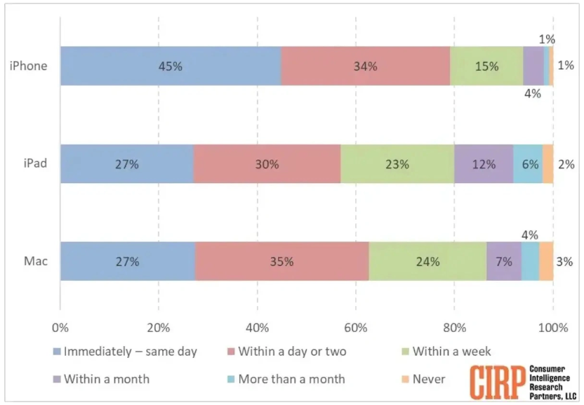 從報(bào)告中獲悉,iPad 和 Mac 的維修和購(gòu)買新機(jī)的時(shí)間會(huì)稍長(zhǎng)一些。80% 的 iPad 用戶會(huì)在一周內(nèi)修理或者購(gòu)買新機(jī),而這個(gè)數(shù)字在 Mac 設(shè)備用戶上為 86%。