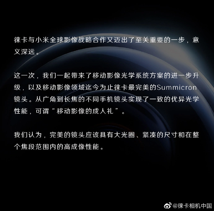 徠卡表示,這次與小米一起帶來了移動影像光學系統方案的進一步升級,以及移動影像領域迄今為止徠卡最完美的 Summicron 鏡頭。從廣角到長焦的不同手機鏡頭實現了一致的優異光學性能,可謂“移動影像的成人禮”。