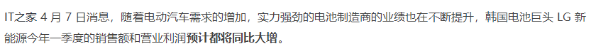4 月 7 日消息,隨著電動(dòng)汽車需求的增加,實(shí)力強(qiáng)勁的電池制造商的業(yè)績也在不斷提升,韓國電池巨頭 LG 新能源今年一季度的銷售額和營業(yè)利潤預(yù)計(jì)都將同比大增。
