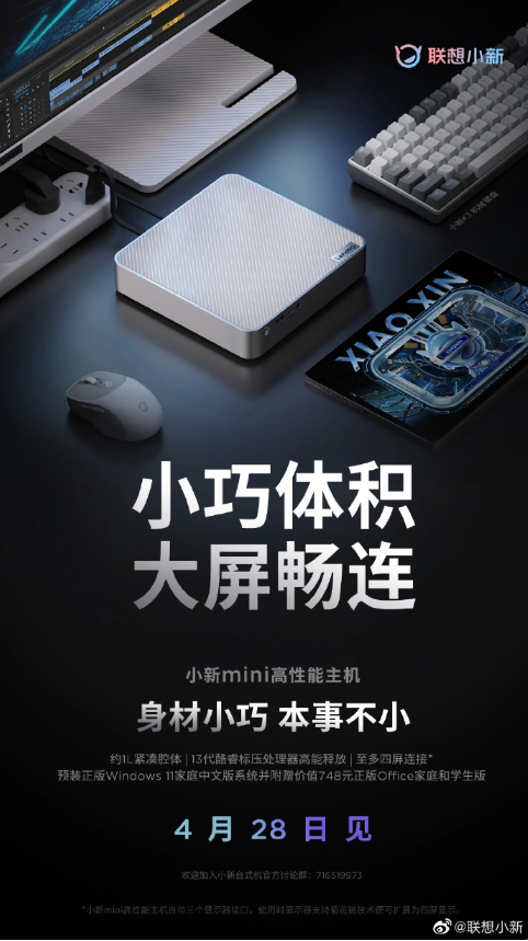 4 月 7 日消息,聯想小新首款 mini 高性能主機宣布將于 4 月 28 日發布,體積約 1L,搭載英特爾 13 代酷睿標壓處理器。
