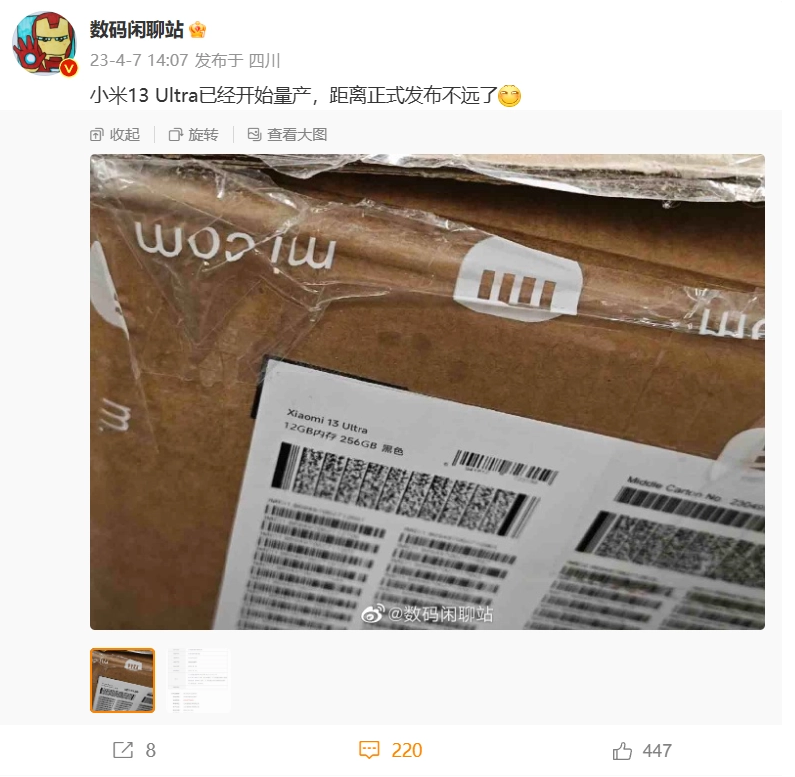 博主 @數碼閑聊站 最新消息稱“小米 13 Ultra 已經開始量產”,并曬出了一張疑似產品包裝的圖片,該圖顯示小米 13 Ultra 將有 12GB + 256GB 黑色版本。