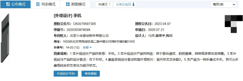 4 月 7 日消息,北京小米移動軟件有限公司申請的“手機”外觀專利獲授權。