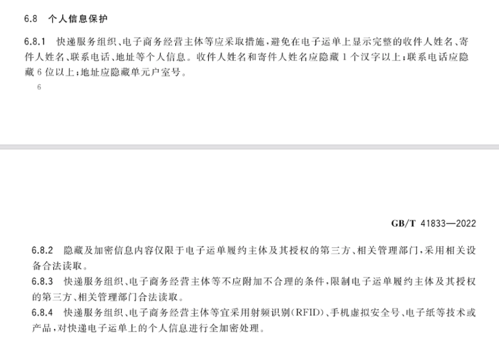 快遞企業、電子商務經營主體等應采取措施,避免在電子運單上顯示完整的收寄件人個人信息。收寄件人姓名應隱藏 1 個漢字以上,聯系電話應隱藏 6 位以上,地址應隱藏單元戶室號。