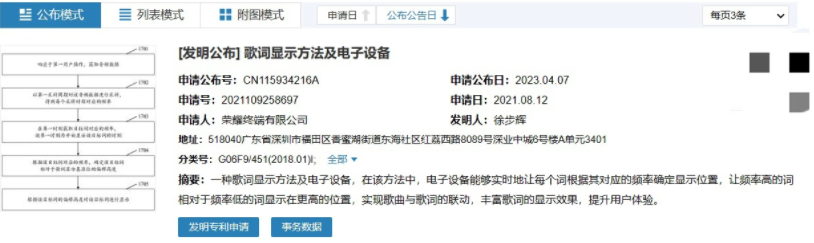 4 月 8 日消息,榮耀終端有限公司新專利“歌詞顯示方法及電子設備”近日公布。