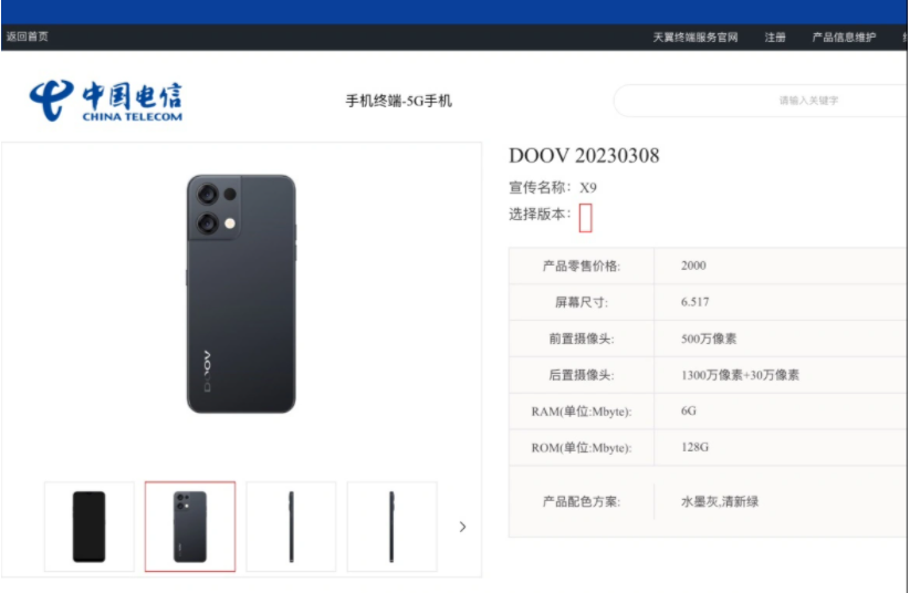 4 月 8 日消息,朵唯新機 ——DOOV X9 近日出現在了中國電信終端產品庫,產品定位“經濟實用”,僅有 6GB+128GB 版本可選,售價為 2000 元,預計將于近期上市開售。