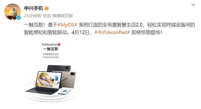 4 月 8 日消息,中興手機官方微博今日發(fā)文官宣,中興 AxonPad 平板電腦將在 4 月 12 日亮相中興行業(yè)終端峰會,并正式發(fā)布。