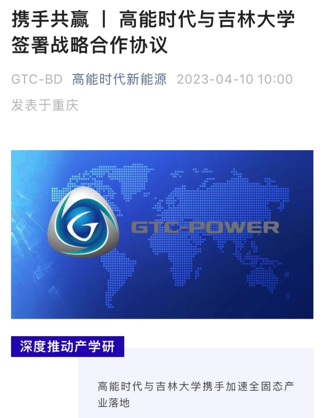4 月 10 日消息,高能時(shí)代新能源官方微信公眾號(hào)今日更新文章,宣布與吉林大學(xué)重慶研究院簽署戰(zhàn)略合作協(xié)議,并有望在年底前合作推出手機(jī)固態(tài)電池。