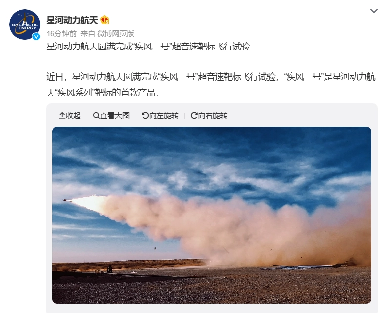原標題:字少事大系列:星河動力航天完成“疾風一號”超音速靶標飛行試驗