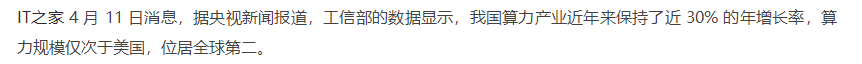 4 月 11 日消息,據(jù)央視新聞報道,工信部的數(shù)據(jù)顯示,我國算力產(chǎn)業(yè)近年來保持了近 30% 的年增長率,算力規(guī)模僅次于美國,位居全球第二。