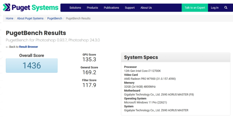 根據(jù) Puget Bench 的跑分信息,一臺(tái)搭載了 i7-12700K 處理器和 Radeon W7900 Pro 顯卡的機(jī)器出現(xiàn)在了測(cè)試平臺(tái),GPU 得分 135.3.