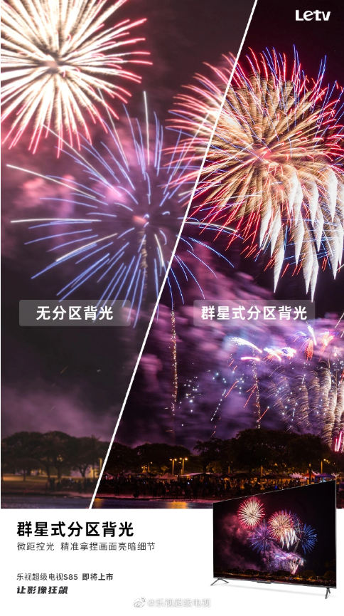 樂視超級電視 S85 采用「群星式」分區背光 —— 最高可達 120 個背光分區。精細控光,可以將暗面、亮面中的細節展現出來。