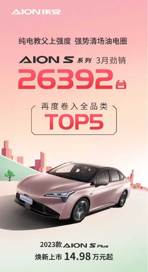 4 月 12 日消息,廣汽埃安宣布,AION S 系列汽車 3 月銷量 26392 臺,銷量上升至油電全品類 TOP,位居 A 級純電及燃油轎車 NO.1.