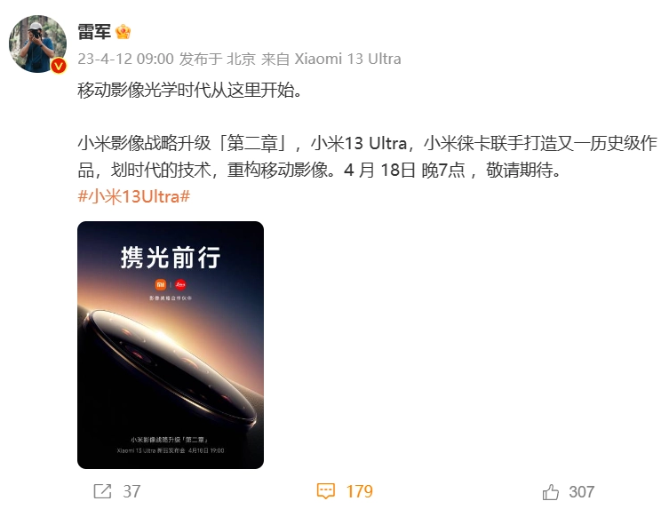 4 月 12 日消息,小米 13 Ultra 最新影像旗艦手機定檔 4 月 18 日晚 7 點發布,號稱“小米影像戰略升級「第二章」”。