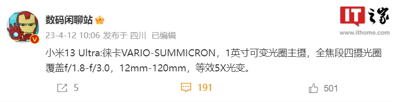 剛剛博主 @數(shù)碼閑聊站 曝光了小米 13 Ultra 的影像配置,該機(jī)搭載徠卡 VARIO-SUMMICRON 鏡頭,1 英寸可變光圈主攝,全焦段四攝光圈覆蓋 f / 1.8-f / 3.0.12mm-120mm,等效 5X 光變。