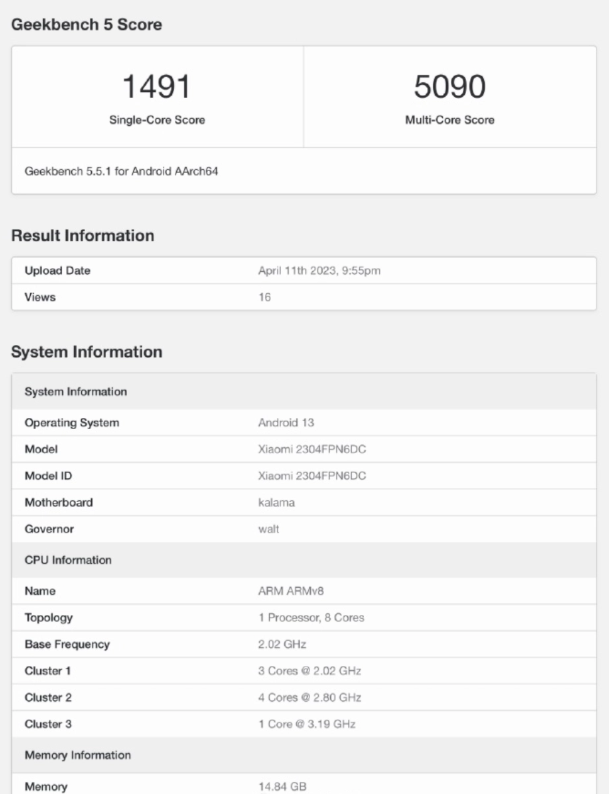兩次跑分顯示,小米 13 Ultra 單核 1491 分、多核 5090 分,以及單核 1473 分、多核 5095 分,就是正常驍龍 8 Gen 2 的水平。該機還擁有 16GB 內存,運行 Android 13 系統。