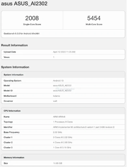 4 月 13 日消息,據 gsmarena 報道,華碩旗下一款型號為“ASUS_AI2302”的機型近日現身 Geekbench 數據庫,預計為華碩 Zenfone 10 手機。