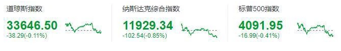 道瓊斯指數收于 33646.50 點,下跌 38.29 點,跌幅 0.11%;標準普爾 500 指數收于 4091.95 點,跌幅 0.41%;納斯達克指數收于 11929.34 點,跌幅 0.85%。
