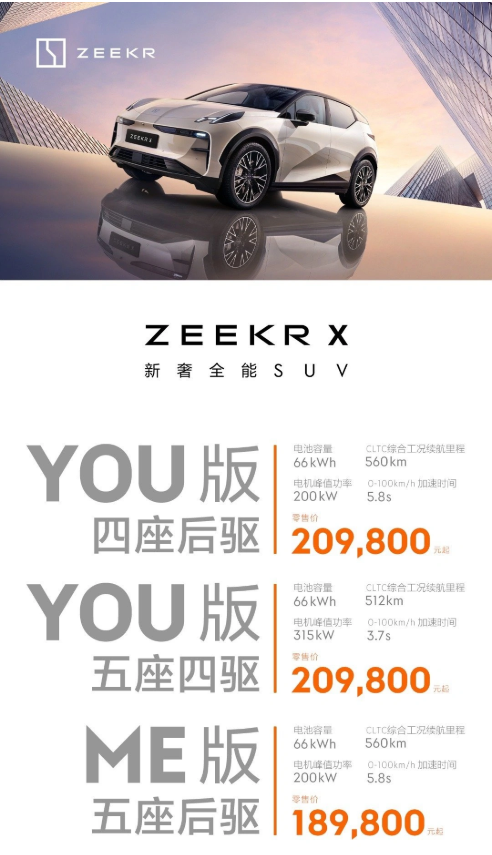極氪 X 定位緊湊型性能 SUV,基于 SEA 浩瀚純電架構(gòu)打造,提供單電機(jī)和雙電機(jī)車型可選,雙電機(jī)版本 0-100km / h 加速時間為 3.7 秒,續(xù)航 500-560km。