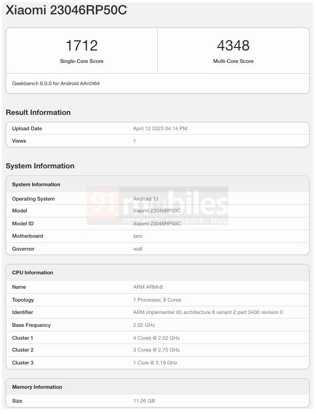 Geekbench 認(rèn)證頁面顯示,小米 Pad 6 平板電腦單核跑分為 1712 分,多核跑分為 4348 分,搭載驍龍 8+ Gen1 移動平臺,最大可選 12GB 運(yùn)行內(nèi)存,預(yù)裝 Android 13 操作系統(tǒng)。